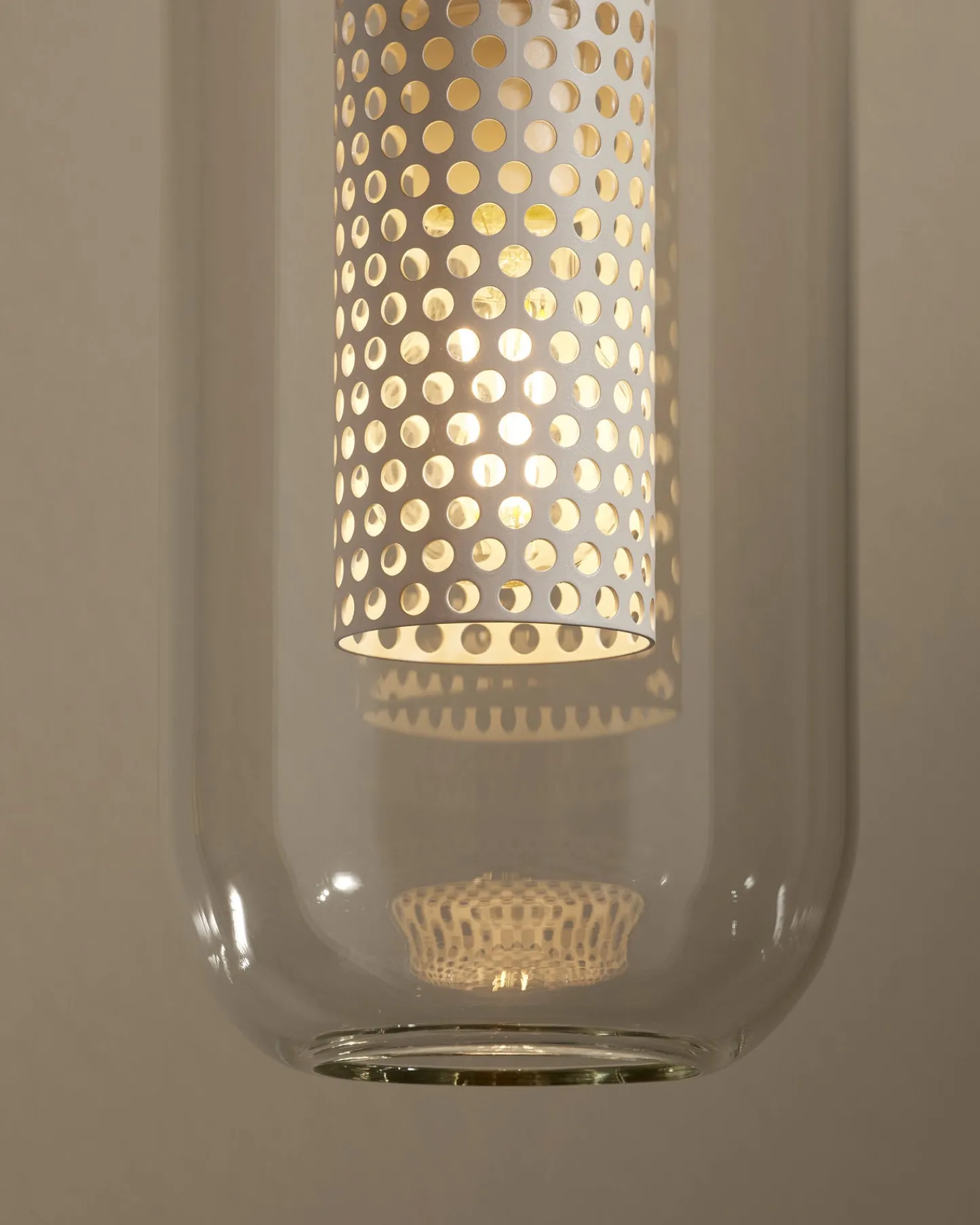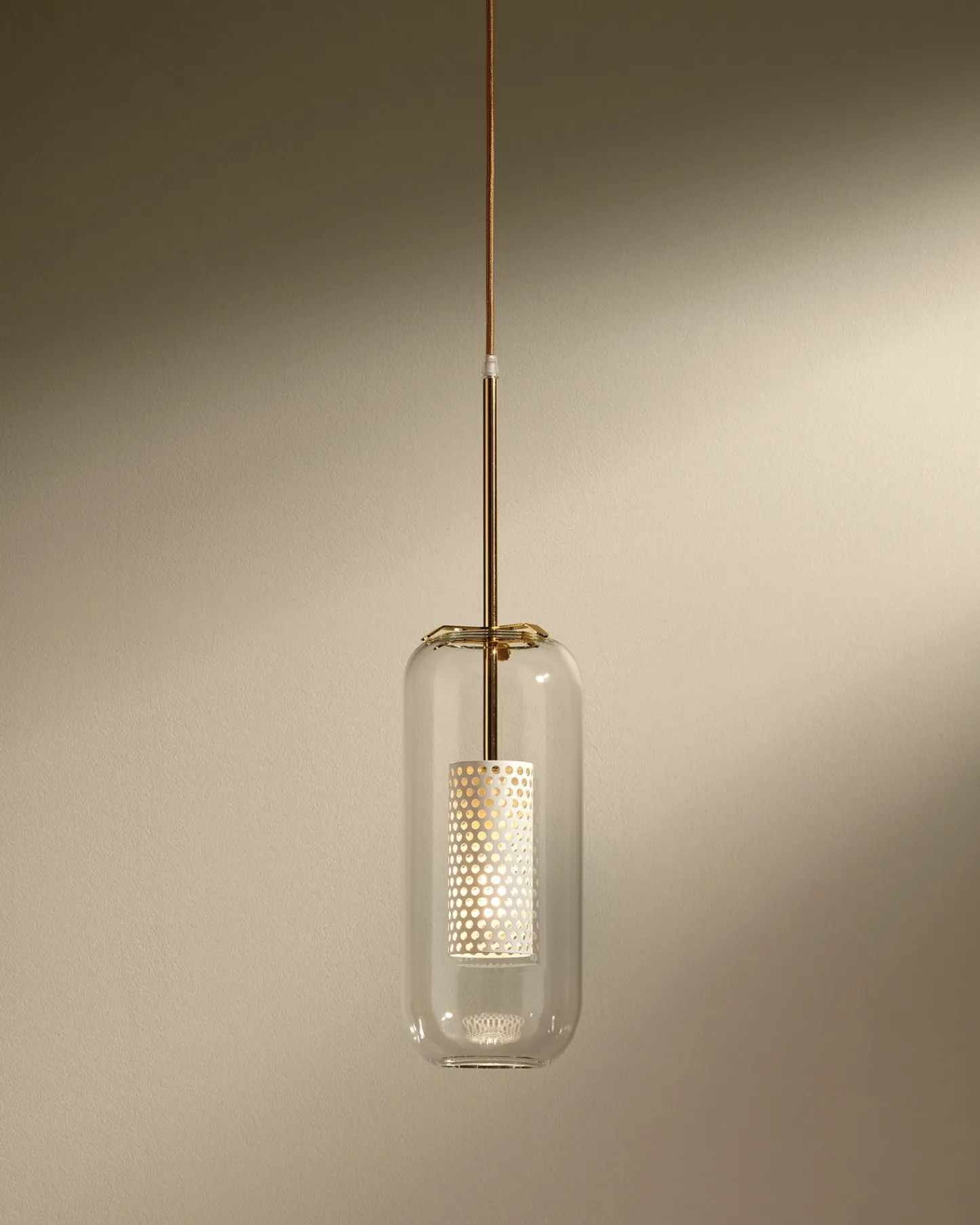 Grâce à ses lignes épurées, elle convoque une douce lumière. Sa tige d’acier doré, sur laquelle est suspendue l’ampoule, son bulbe en verre généreux et ses lignes épurées créent un halo suspendu.