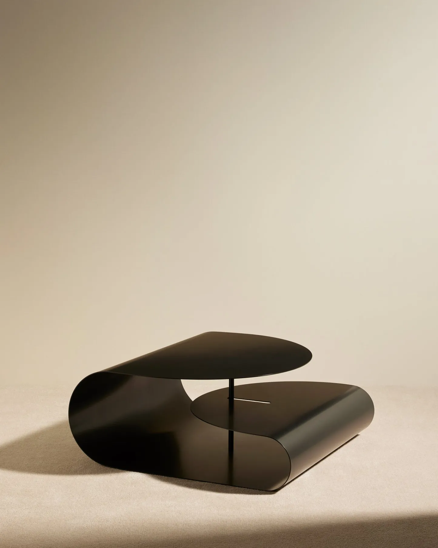 En volupté. Héritière des premiers travaux du Studio sur lʼacier, la collection Gégé met sur un piédestal la pureté de ce matériau signature. Avec ses volumes généreux et son chassé-croisé harmonieux, la table basse éponyme fait son effet.