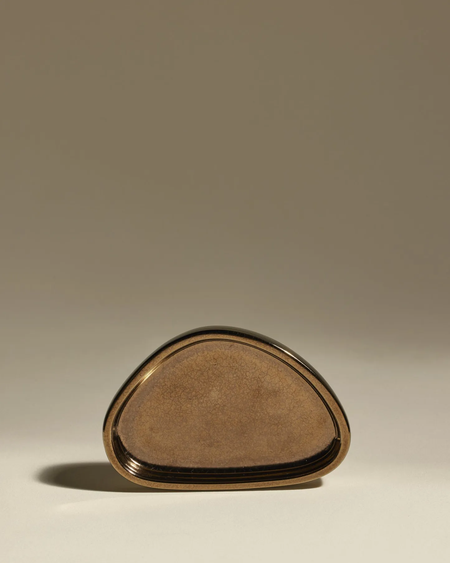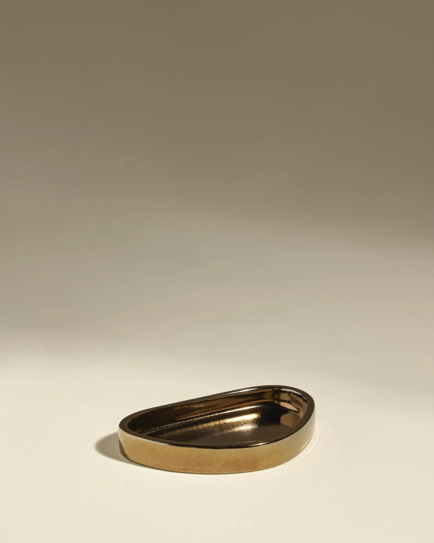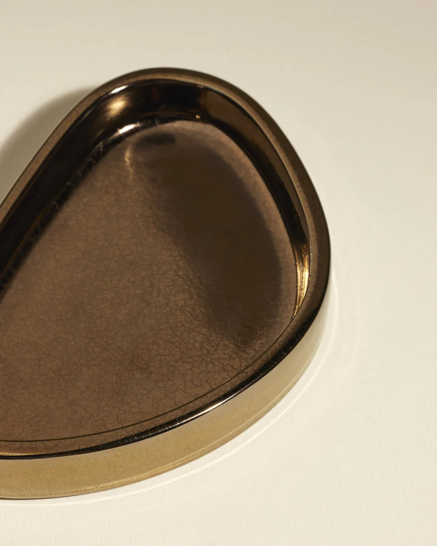 Ruée vers l’or. Pièce singulière de Maison Sarah Lavoine, le vide-poche Mars est pensé en céramique, une matière délicate et fonctionnelle. Son émail réactif Mordoré lui confère des nuances chatoyantes, changeantes au fil de la journée, selon la lumière.