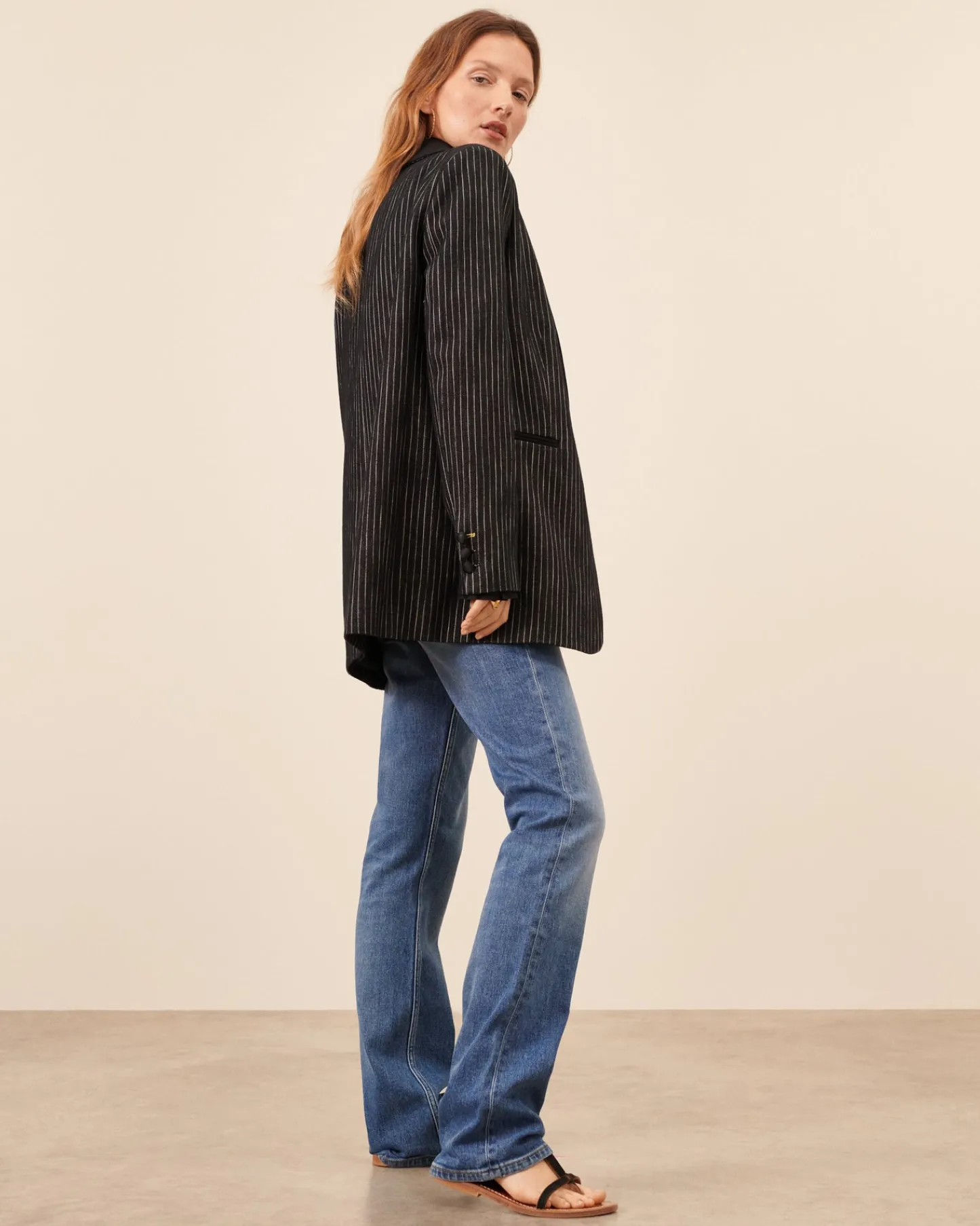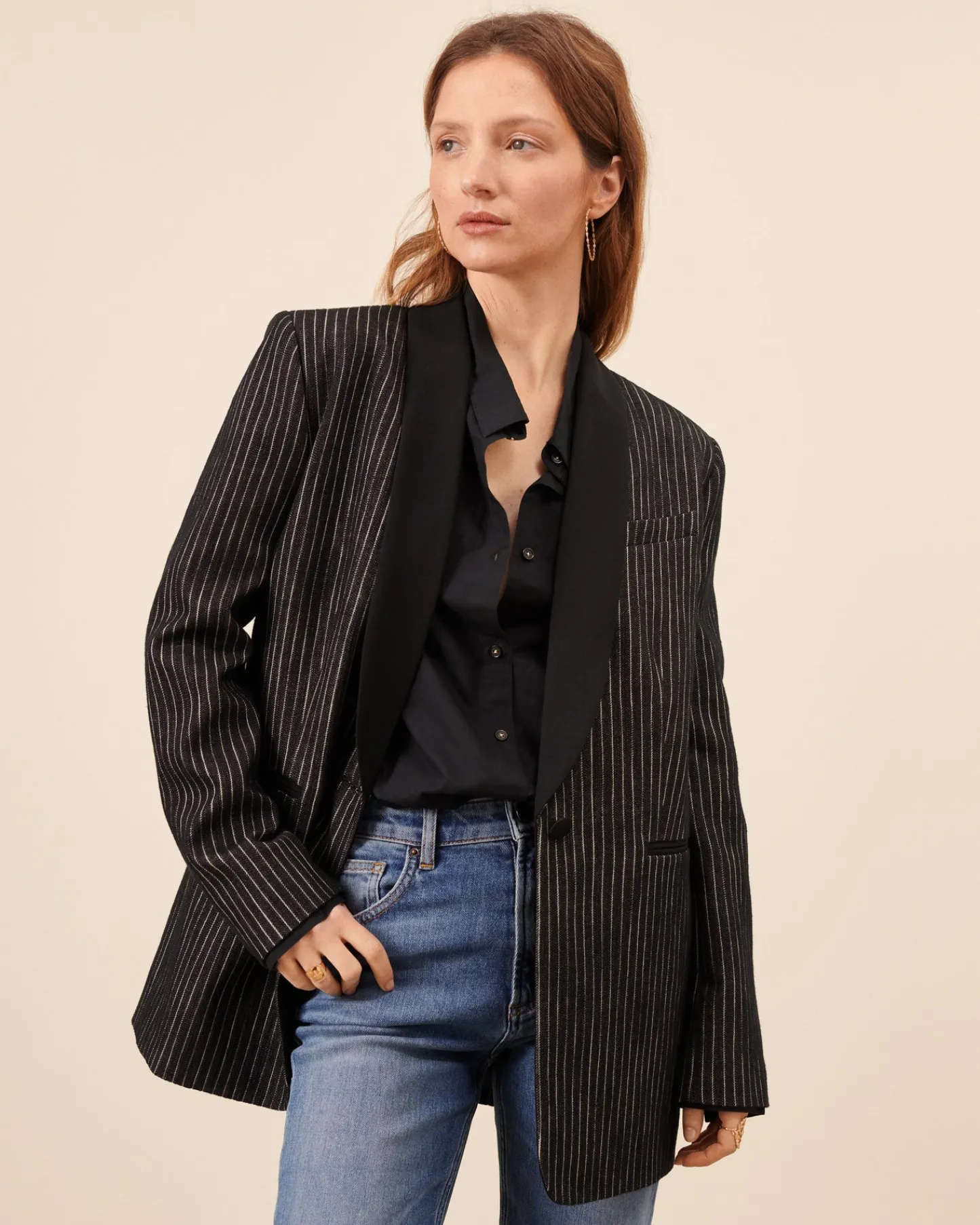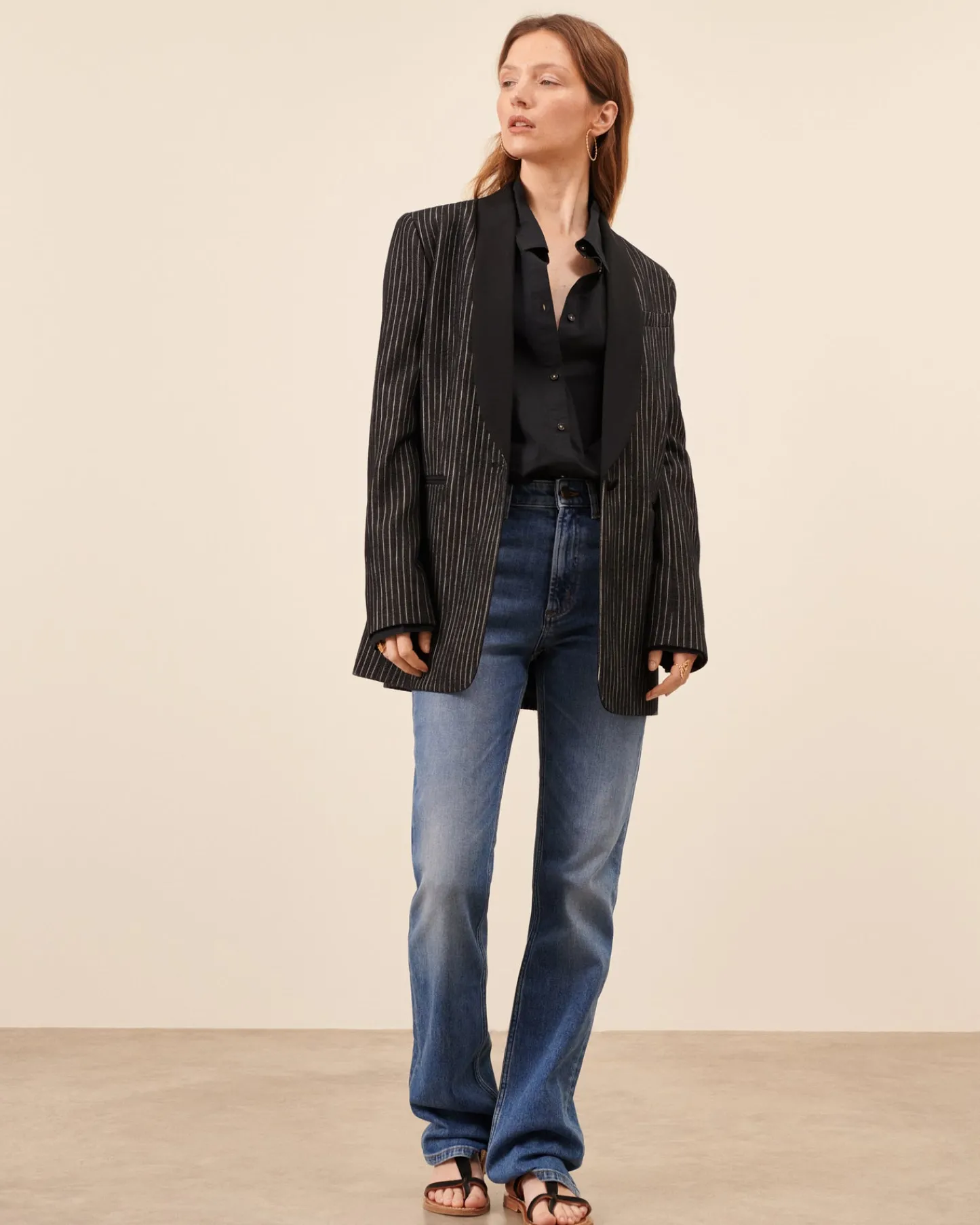 La rayure tennis, un classique que Sarah affectionne tant. Ambroise joue sur l’équilibre entre l’héritage masculin et le raffinement, twistant une matière brute avec des détails précieux comme ses boutons en satin.