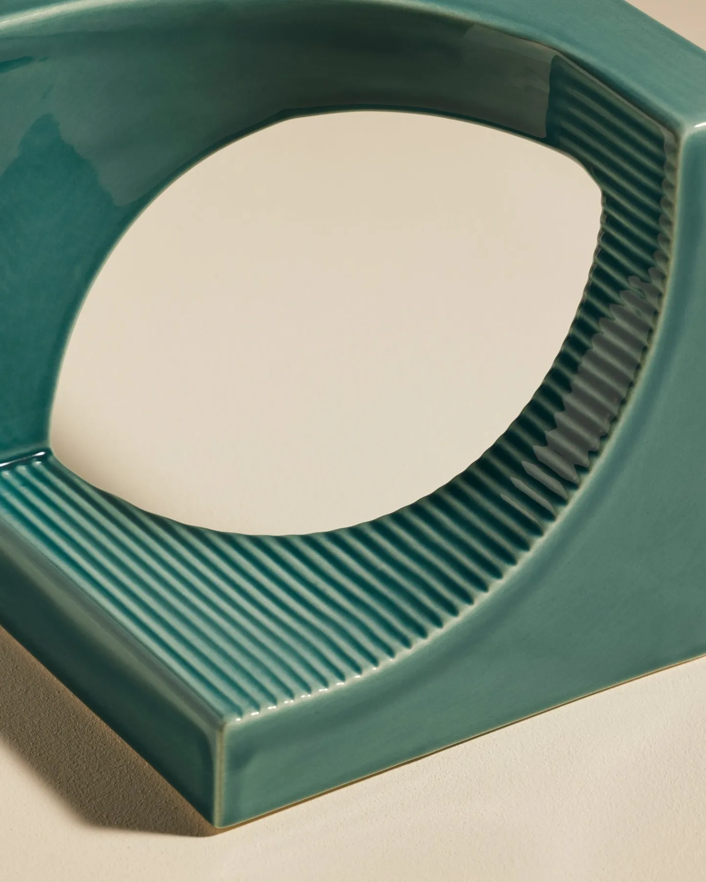 Coulée en céramique et patinée d’un émail tantôt réactif (coloris Noisette), tantôt brillant (coloris Noir et Amazonite), cet objet décoratif et fonctionnel est une pièce unique.