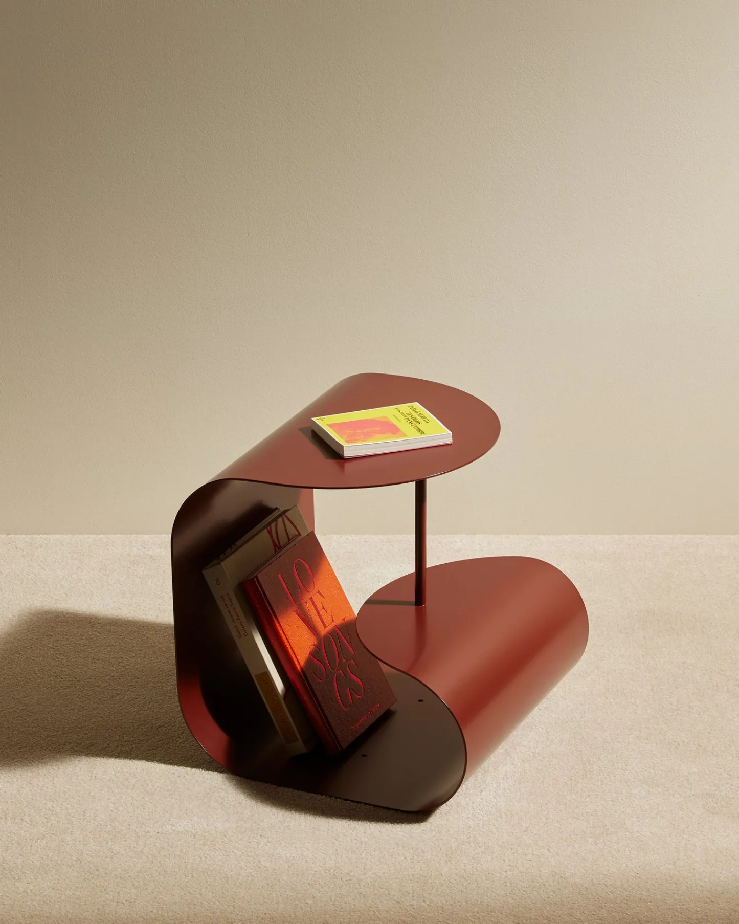 Pièce architecturale qui peut se suffire à elle-même, cette table basse aux deux pliages et à la tige centrale se métamorphose à l’envi en chevet, bout de canapé ou range-magazines.
