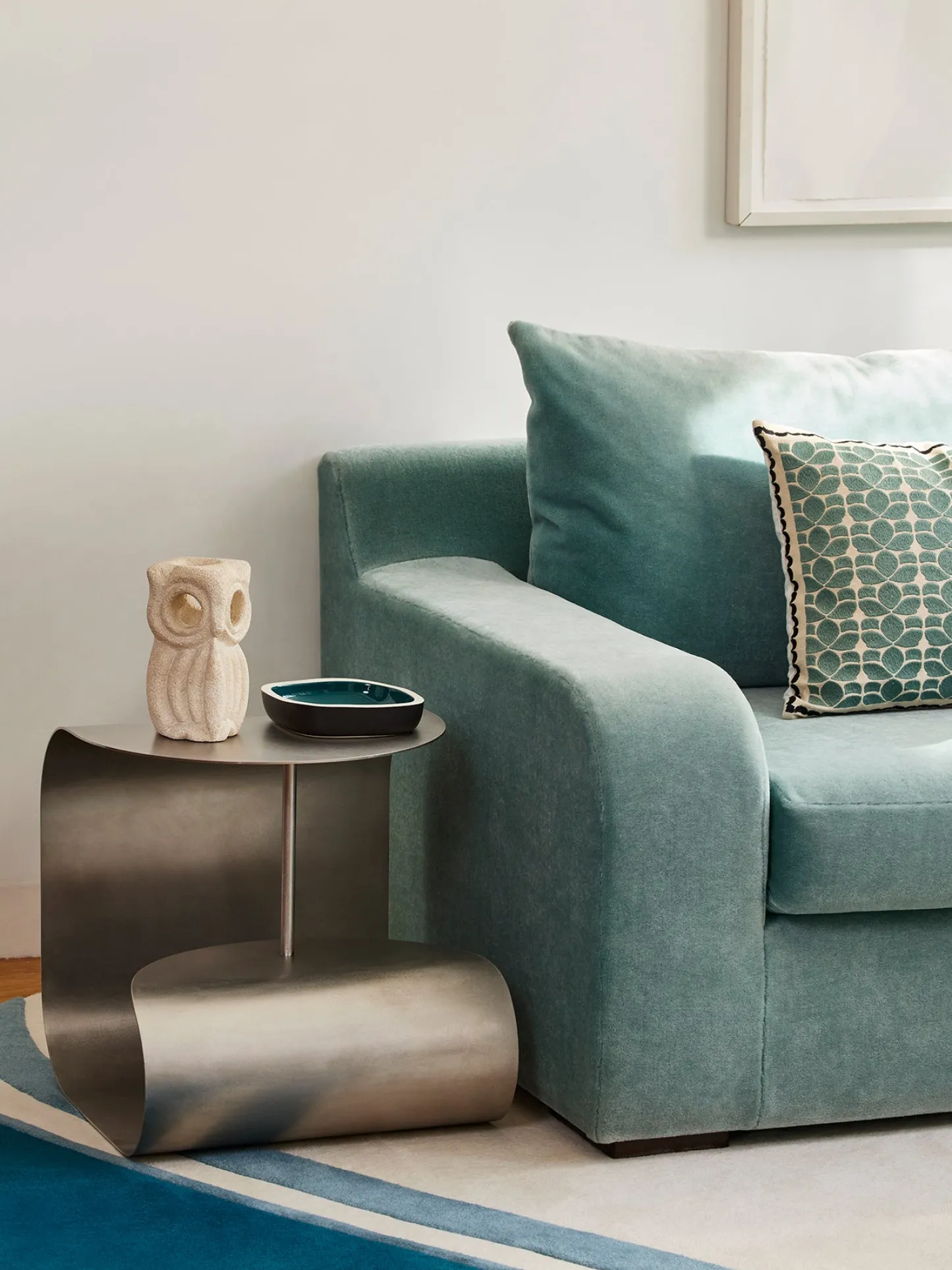 Pièce architecturale qui peut se suffire à elle-même, cette table basse aux deux pliages et à la tige centrale se métamorphose à l’envi en chevet, bout de canapé ou range-magazines.