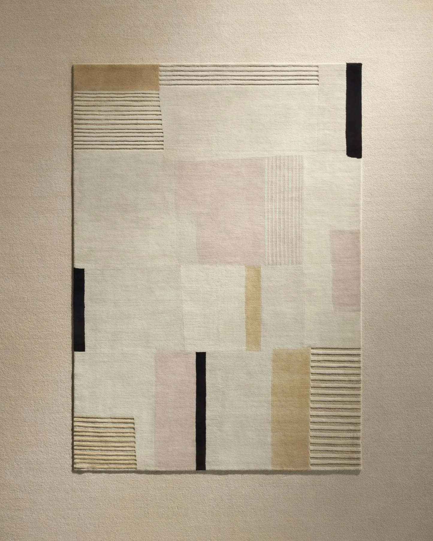 Le tapis Boro est un véritable tableau, il se compose d’un camaïeu de beige, rose, et est rehaussé par des rayures noires.