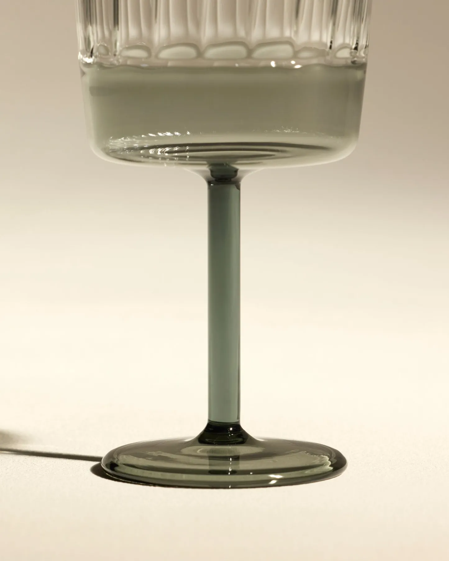 Du verre cannelé transparent délicatement posé sur une bande de verre coloré, le tout dressé sur pied. Le verre à eau Eclat s’accompagne du verre à vin et du gobelet de la même collection, disponibles en Bleu Sarah, Ambre et Charbon.